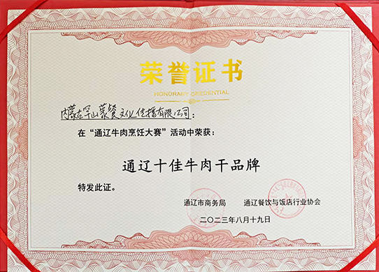 通遼罕山蒙餐文化傳播有限公司在“通遼牛肉烹飪大賽”活動中榮獲通遼十佳牛肉干品牌